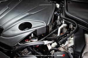 The AMS Performance Q50/Q60 Red Alpha Fuel Filter Kit has been designed to be the highest quality and most sophisticated solution for fuel filtering of the VR30 engine on the market. As many have experienced, OEM fuel system component failures are fairly common on the VR30 engine, especially when using higher concentrations of ethanol like E50 or E85. Ethanol is an excellent high octane fuel source with its high alcohol content, and because of this it also acts as a cleaning agent. For some cars, this can dislodge sediment in the fuel tank and lines built up over years of running low grade gasoline. One of the best ways to prevent this dislodged foreign object debris from making its way into the injectors or engine itself is by utilizing a high quality in-line fuel filter. Installation Instructions