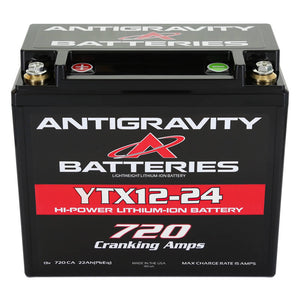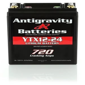 At a massive 720 Cranking Amps and extremely compact size, the Antigravity YTX12-24 Lithium Battery offers the most power in the smallest package you can find for motorsports. There is no powersports battery model on the market that has this type of POWER! This lightweight lithium battery is best used for applications where Extreme Power in an ultra compact size are desired such as Large V-Twin Motors, Touring Bikes, Adventure Bikes and Race Cars. The YTX12-24 does not have our RE-START built-in jump-starting feature but offers a deeper level of Discharge for more usable Capacity and more Power for Cranking.