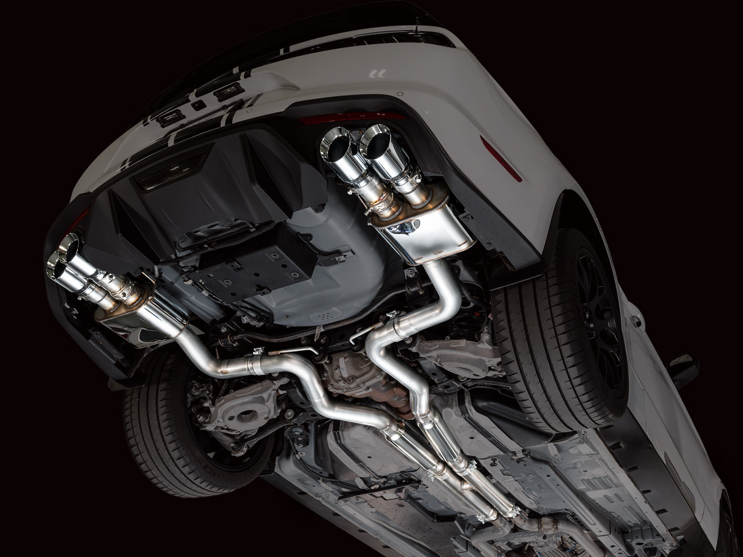Quad 4” slash-cut, double-walled tips available in chrome silver or diamond black.