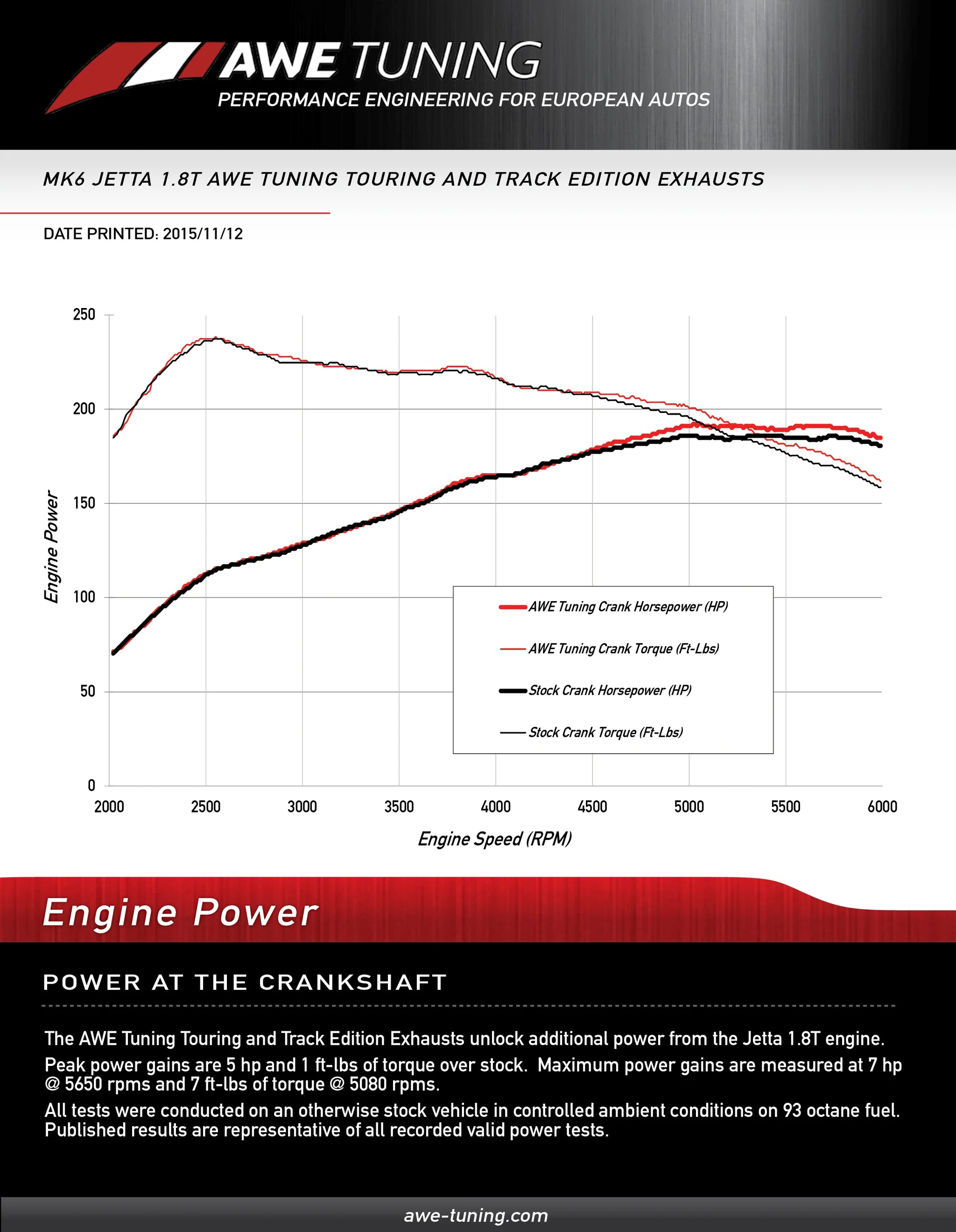 The AWE Track Edition for the MK6 Jetta GLI replaces the factory exhaust and includes a straight-through resonator, but to allow a more aggressive exhaust tone, the Track Edition does not include AWE 180 Technology®. Perfect for those who like it loud. Please note that this is a loud system and buyers should be aware. This product cannot be returned or exchanged based upon sound satisfaction.