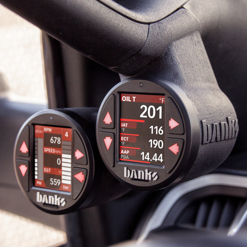 Banks iDash is the smallest, most powerful plug-n-play OBD-II monitor and control interface on the market. With its easy to read 2- to 8-gauge user selectable LCD display, the iDash 1.8 reads a multitude of engine parameters and internal data directly the vehicles ECU via OBD-II. It also opens a whole new world of Banks exclusive calculated parameters not available on any other device. Set custom low and high alerts for any engine parameter. Monitor max and min values for a user selectable list of parameters. Read and clear trouble codes on-the-fly. Customize the navigation button and LCD display colors, brightness, and even the rate at which they dim at night. Daisy chain 4 iDash gauges and view up to 32 parameters simultaneously. Add Banks sensor modules such as the 4-channel analog module, 4-channel thermocouple module, and AirMouse Ambient Air Density Module for nearly infinite vehicle and weather analysis. For those who want to record their vehicles parameters, the iDash DataMonster adds data logging for up to 100 user selectable parameters at a rate of up to 20 samples per second. With the included microSD card, owners can log over a months worth of continuous data. Data can be played back right on the iDash or transferred to a computer for deeper analysis. Expand functionality with Banks Modules (Pressure/Temp Sensors, and more). Owner's Manual Owner's Manual Technical Bulletin Technical Bulletin Owner's Manual Owner's Manual Technical Bulletin Owner's Manual