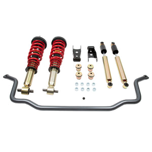 Combining our newly released independent damping adjustable front coilovers and supporting rear shocks with our time-tested lowering components equal the optimum in sporttruck handling all in one convenient package. Kits will contain (depending on Application), a combination of height adjustable coilovers, shock absorbers, sway bars and lowering components to give you a vast improvement over oem in overall performance and handling all while still retaining that comfortable ride quality.