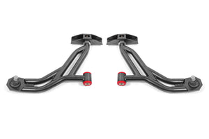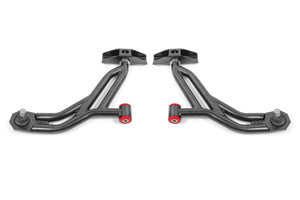 A-arms are one of the most important, yet overlooked suspension components. They are the direct link between the front wheels and the chassis. Any deflection causes a change in alignment, which results in poor performance and driving feel. Fabricated from heavy-duty 1.25-inch, 0.120-inch wall DOM tubing, deflection is eliminated with A-arms from BMR Suspension. BMR?s AA754 Lower A-arms are equipped with greasable heavy-duty ball joints, 95-durometer polyurethane bushings (front mount), and greasable Delrin bushings (rear mount) to handle the high loads. Polyurethane bushings add a solid, more responsive feel over the stock rubber bushings. BMR?s bushings are internally fluted, which allows grease to evenly coat the inner sleeve. These flutes also direct grease to the outer edge of the bushing, keeping the thrust surface lubricated. This efficient lubrication ensures quiet, reliable operation over the life of the bushings. The combination of poly and Delrin bushings gives you improved steering feel and responsiveness for any type of driving.