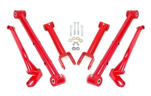 BMRs polyurethane bushings are designed to be compliant enough to give you a comfortable ride and absorb NVH, while remaining firm enough to stand up to high loads of any performance environment. The bushings easily handle the high compression loads of aggressive launches and hard acceleration, yet offer plenty of articulation for great handling. The reinforcement braces provide additional strength to the rear suspension for a more responsive driving experience. This product is the perfect upgrade for the enthusiast looking to improve performance, while maintaining acceptable NVH levels and ride quality. When performance is a must, rely on BMR Suspension!BMR Suspensions Rear Suspension Kits are available in black hammertone and red powdercoat for long-lasting good looks. Installation time is about 2-3 hours. Proudly made in the U.S.A.!