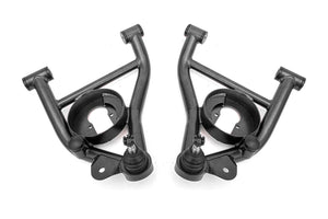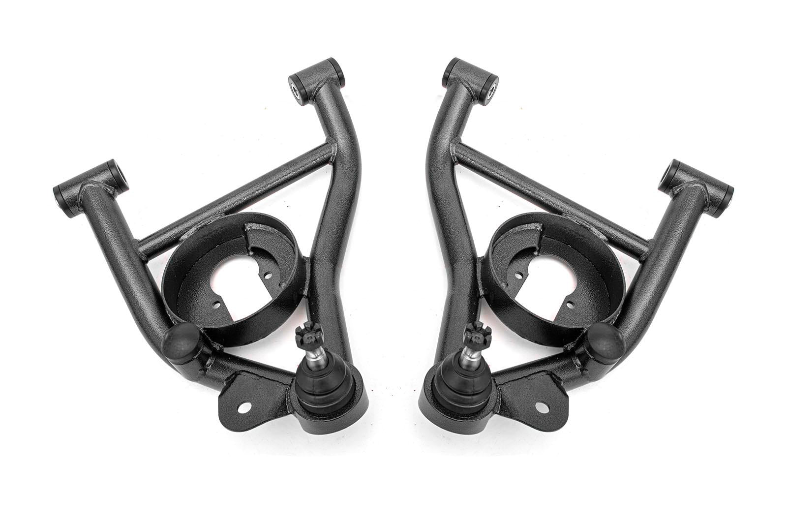 A-arms are one of the most important, yet overlooked suspension components. They are the direct link between the front wheels and the chassis. Any deflection causes a change in alignment, which results in poor performance and driving feel. Fabricated from heavy-duty 1.500-inch, 0.095-inch wall and 1.525-inch, 0.095-inch wall DOM tubing with laser-cut, CNC-formed plate steel braces for extra strength, deflection is eliminated with A-arms from BMR Suspension. BMRs AAL461 Lower A-arms are fitted with heavy-duty ball joints and greaseable, Delrin bushings add a solid, more responsive feel over the stock rubber bushings. BMRs bushings are internally fluted, which allows grease to evenly coat the inner sleeve. These flutes also direct grease to the outer edge of the bushing, keeping the thrust surface lubricated. This efficient lubrication ensures reliable operation over the life of the bushings.BMRs AAL461 Lower A-arms eliminate A-arm deflection, greatly improving steering feel and response in normal and performance driving situations. The Delrin bushings add strength and eliminate deflection compared to stock rubber bushings. The tubular design gives you tons of added strength and a significant reduction in weight over the stock arms. The means you get a great blend of performance and comfort. Designed for street performance, drag race, and road course applications.BMR Suspension AAL461 Non-Adjustable Lower A-arms are available in black hammertone and red powdercoat for long-lasting good looks. Installation time is 3-4 hours. Proudly made in the U.S.A.