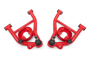 A-arms are one of the most important, yet overlooked suspension components. They are the direct link between the front wheels and the chassis. Any deflection causes a change in alignment, which results in poor performance and driving feel. Fabricated from heavy-duty 1.500-inch, 0.095-inch wall and 1.525-inch, 0.095-inch wall DOM tubing with laser-cut, CNC-formed plate steel braces for extra strength, deflection is eliminated with A-arms from BMR Suspension. BMRs AAL461 Lower A-arms are fitted with heavy-duty ball joints and greaseable, Delrin bushings add a solid, more responsive feel over the stock rubber bushings. BMRs bushings are internally fluted, which allows grease to evenly coat the inner sleeve. These flutes also direct grease to the outer edge of the bushing, keeping the thrust surface lubricated. This efficient lubrication ensures reliable operation over the life of the bushings.BMRs AAL461 Lower A-arms eliminate A-arm deflection, greatly improving steering feel and response in normal and performance driving situations. The Delrin bushings add strength and eliminate deflection compared to stock rubber bushings. The tubular design gives you tons of added strength and a significant reduction in weight over the stock arms. The means you get a great blend of performance and comfort. Designed for street performance, drag race, and road course applications.BMR Suspension AAL461 Non-Adjustable Lower A-arms are available in black hammertone and red powdercoat for long-lasting good looks. Installation time is 3-4 hours. Proudly made in the U.S.A.