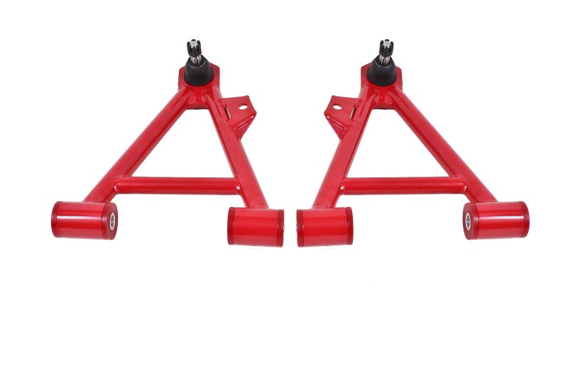 A-arms are one of the most important, yet overlooked suspension components. They are the direct link between the front wheels and the chassis. Any deflection causes a change in alignment, which results in poor performance and driving feel. Fabricated from heavy-duty 1.5-inch, 0.095-inch wall and 1.25-inch, 0.095-inch wall DOM tubing, deflection is eliminated with A-arms from BMR Suspension. BMR?s AA041 Lower A-arms are equipped with greasable, 95-durometer polyurethane bushings. Polyurethane bushings add a solid, more responsive feel over the stock rubber bushings. BMR?s bushings are internally fluted, which allows grease to evenly coat the inner sleeve. These flutes also direct grease to the outer edge of the bushing, keeping the thrust surface lubricated. This efficient lubrication ensures quiet, reliable operation over the life of the bushings.