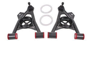 A-arms are one of the most important, yet overlooked suspension components. They are the direct link between the front wheels and the chassis. Any deflection causes a change in alignment, which results in poor performance and driving feel. Fabricated from heavy-duty 1.5-inch, 0.095-inch wall and 1.25-inch, 0.095-inch wall DOM tubing, deflection is eliminated with A-arms from BMR Suspension. BMR?s AA043 Lower A-arms are equipped with greasable, 95-durometer polyurethane bushings. Polyurethane bushings add a solid, more responsive feel over the stock rubber bushings. BMR?s bushings are internally fluted, which allows grease to evenly coat the inner sleeve. These flutes also direct grease to the outer edge of the bushing, keeping the thrust surface lubricated. This efficient lubrication ensures quiet, reliable operation over the life of the bushings.