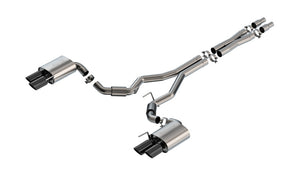 EXCEPT Convertible. This 3" diameter True Dual Quad Tip BORLA Cat-Back system features a merge X-Pipe for increased performance and improved sound. This system features the classic S-Type sound with no drone inside the vehicle and 4" black chrome on T-304 stainless steel tips, and is for vehicles WITHOUT the Active Exhaust feature. Using BORLA Stainless Steel Polish p# 21461 is NOT recommended with these black chrome tips. We suggest cleaning the tips with hot water and a microfiber cloth. Systems with bright chrome on T-304 stainless steel tips, and carbon fiber tip sare also available. If your car has 1 tip on each muffler and you want to upgrade it to 2 tips on each muffler (also know as quad tips), this is the system for you. It is designed to work with the quad tip (2 tips per muffler) O.E. Ford Valance ONLY. If you want to install this system on a vehicle that came with one tip per muffler you will NEED TO BUY and install a different valance. Ford quad tip valance part numbers: With Parking Sensors = PR3Z-17F828-DA, Without Parking Sensors = PR3Z-17F828-CA. /P>BORLA Cat-Back and Axle-Back exhaust systems feature patented straight-through and multi-core technology designed to unleash hidden horsepower. Increased exhaust velocity adds power, driving excitement, fuel economy, and the distinctive BORLA Sound of Power respected by motoring enthusiasts everywhere. Each system is built from premium T-304 stainless steel, superior to T-400 series knockoffs (such as 409), to give you the absolute best in performance and durability. Ultra-smooth mandrel bends ensure maximum flow & power, and precision computer numerical control (CNC) manufacturing ensures an accurate fit. Best of all, BORLA stands behind every system with a Million-Mile Warranty. Just what you'd expect from the world's most experienced (and most winning) exhaust brand.