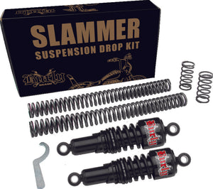 This Burly Brand Slammer Kit includes 10.5 in. Slammer shocks and dropped fork springs in one easy to install, price-friendly kit. Does not require disassembly of the forks and can be installed with the front end still on the bike.