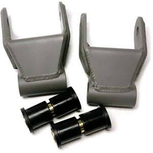 Our Camburg MIG shackles replace the stock light-duty version on your F-150. The stock shackles are stamped out of thin metal and use a rubber bushing which both allow for a flexy component that also binds as it cycles since the rubber bushings are vulcanized into the shackle. Our shackles are a fabricated boxed gusseted design that is much stronger and use polyurethane bushings that pivot smoother with less flex. They are MIG welded and we powder coat them a textured gray to match our billet arms and the FOX shock hard anodize. They are ready to be bolted on using the factory hardware. These are available in a stock length, so they do not raise or lower the ride height or an 1.5" extended version that will lower the ride height about 1". Both are designed for stock and Deaver leaf springs, the "stock length" versions do not work with icon leaf springs. CAD Designed, CNC Laser Cut & Formed MIG Welded Polyurethane Bushings Powder coated textured gray Made in the USA The stock length shackles are 4.5" eye to eye and the extended are 6".