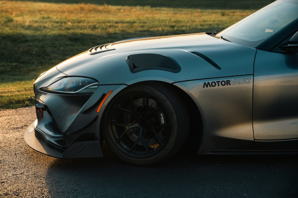 The fender vents improve overall cooling efficiency by alleviating the high-pressure air caught by the factory fender wells. These items also add a bump in the front-end downforce, further enhancing the front-end aerodynamic efficiency of the MK5 Supra.