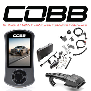 The Stage 2 + CAN Flex Fuel Power Package includes an Accessport V3, Carbon Fiber Intake System, Front Mount Intercooler (Black), CAN Flex Fuel Upgrade and a COBB Vehicle Badge for your Raptor 2017-2020.