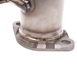 A cast 304L stainless steel 2-bolt flange ensures a true mating surface. A counter-bore and raised collar integrated into the casting moves the weld location away from the mating surface which prevents warping during assembly and provides a smooth transition into the tubing. The factory gasket and hardware can be re-used to install.