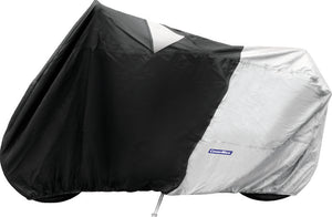 Deluxe heavyweight all-weather cover from CoverMax®. Top made of water-resistant 420-denier 100% polyester, with PU coating. Bottom is made of 65/35 polyester/cotton mix with heat- resistant, PU coating. Waterproof heat-sealed seams. Improved vents remain open at all times. Sewn-in grommets for improved attachment of anti-theft devices. Sewn-in soft windshield liner. Elastic cords sewn into bottom for a snug fit.
