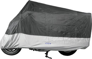Deluxe heavyweight all-weather cover from CoverMax®. Top made of water-resistant 420-denier 100% polyester, with PU coating. Bottom is made of 65/35 polyester/cotton mix with heat- resistant, PU coating. Waterproof heat-sealed seams. Improved vents remain open at all times. Sewn-in grommets for improved attachment of anti-theft devices. Sewn-in soft windshield liner. Elastic cords sewn into bottom for a snug fit.