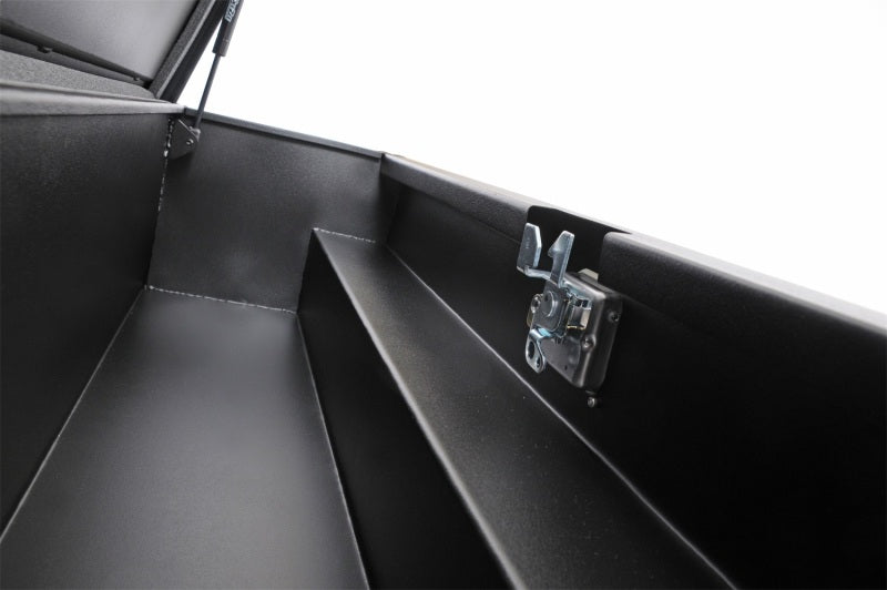 Dee Zee Tool Box - Hardware Series Side Mount Boxes. Constructed of durable 20-gauge steel. Protected by texture black NRT(TM) (No Rust Technology) rust inhibitor powder coat finish. Crown style lid with a full pan double-V stiffener for superior rigidity. Other features: lockable stainless steel paddle handles, dampened gas shocks, closed cell foam gasket, and self-adjusting strikers. Installation Instructions