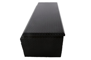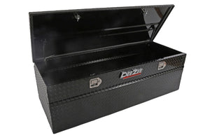 Dee Zee Tool Box - Red Label Chest. Constructed of heavy duty Brite-Tread aluminum. Black-Tread powder coat, provides a gloss black finish while it protects and prevents oxidation. Crown style lid with a full pan double-V stiffener for superior rigidity. Extra wide design for maximum storage space. Other features: lockable stainless steel paddle handles, dampened gas shocks, closed cell foam gasket, and self-adjusting strikers.