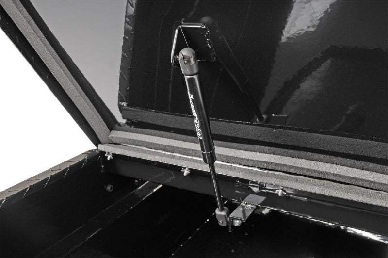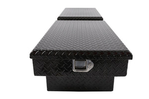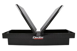 Dee Zee Tool Box - Red Label Double Lid (Gull Wing) Crossover. Constructed of heavy duty Brite-Tread aluminum. Black-Tread powder coat, provides a gloss black finish while it protects and prevents oxidation. Crown style lid for superior rigidity. Other features: lockable stainless steel paddle handles, dampened gas shocks, closed cell foam gasket, and self-adjusting strikers. Removable plastic tool tray to help keep small items organized. Installation Instructions