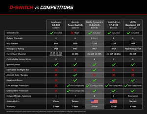 Ultimate Control. The D-Switch is an advanced 8-channel switch panel that gives you full, customized control over any 12V accessory that you want to wire up. Our engineers have tailored it specifically to be the most functional and effective controller when it comes to your lighting setup.