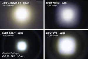 Spot is an unmodified pattern, shining focused light directly from the TIR optic. The result is a highly-focused 7-degree beam of light, perfect for directing light far into the distance. NOTE: The Pro Spot uses a slightly larger emitter which spreads the light output more than the Sport Spot, resulting in a lower candela and lux rating even at a higher power level.