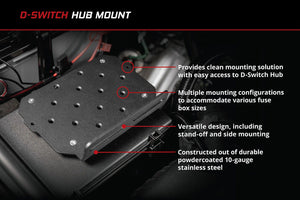 Solid-State, Durable Design. Built for extreme durability, the D-Switch features a solid-state design with no mechanical relays to wear out, or physical fuses to replace. The hub is encapsulated with an aluminum heatsink, ensuring superior heat dissipation. Both the hub and controller feature an IP67 weather resistance rating for all electronics, excluding wiring terminals, ensuring long-term reliability and performance. The mount included in the kit is constructed out of 10-gauge stainless steel and finished in a durable powdercoat. With a 3-year limited warranty, this kit is built to withstand whatever you throw at it, whether you're off-roading or on the road.