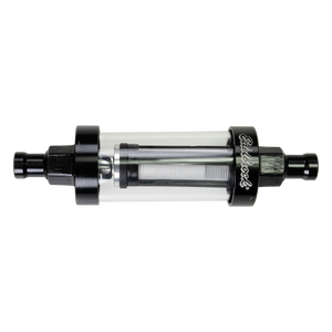 Edelbrock Clear View Fuel Filter for 5/16" I.D. Hose dresses up any carbureted car’s engine bay, providing a quick visual check of fuel flow and condition. Fully machined aluminum ends are laser inscribed with barbed inlet/outlet sizes and attractively E-coated black for durability. For use with rubber fuel lines rated up to 10psi. A serviceable 100-micron nylon filter element keeps dirt and debris from clogging up small passages in your carburetor. The filter element is easily replaced using kit PN 8749.