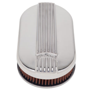 This new line of air cleaner #4115?was created to perfectly match our popular classic aluminum finned valve covers. Three models for single or dual-quads give you plenty of options for that "just right" look on any nostalgia rod or muscle car. Additionally, the small oval air cleaner provides adequate hood clearance in demanding applications as well as a coordinated appearance with the classic finned look. Our classic series air cleaners are available in either a classic polished aluminum or durable black powder coated finish. They come with medical grade, pre-oiled cotton gauze element for excellent filtration. These air cleaners work with all popular 5-1/8" necks, for all carburetors or throttle bodies.