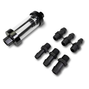 The Edelbrock Clear View Fuel Filters dress up any carbureted car’s engine bay and provide a quick visual check of fuel flow and fuel condition. Fully machined aluminum ends are E-coated for durability with laser inscribed details. The 100-micron filter keeps dirt and debris from clogging up the small passages of your carburetor. Filter elements are easily replaced using kit PN 8749. PN 8750 includes multiple interchangeable injection-molded threaded nipples to fit ¼”, 5/16” or 3/8” i.d. hose sizes.