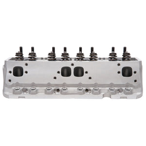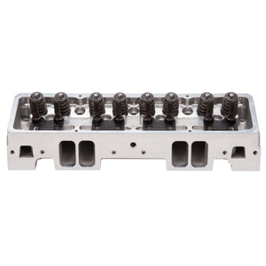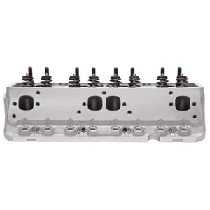 Edelbrock part #61255 Victor Jr. 23deg 220 cylinder head is designed for small-block Chevy Its 64cc combustion chamber yields around 10:1 compression ratio in a typical flat-top application and about 12.5:1 when used with some of the most common 12cc dome pistons. One of the key features of the Victor Jr. 23deg 220 cylinder head is the CNC machined chambers and bowls, which result in consistency and improved performance. They also feature angled spark plug holes and maintain the stock 23deg valve angle as well as the intake flange bolt pattern for use with 1986 and earlier intake manifolds. All of this allows this cylinder head to deliver 530-580 hp potential right-out-of-the-box, making them ideal for a budget minded engine build desiring a high quality cylinder head that still uses a stud and guide plate rocker system. Cylinder Head Specifications: - Exhaust port location: Raised .300" - Spark plug fitment: 14mm x .750 reach, gasket seat
