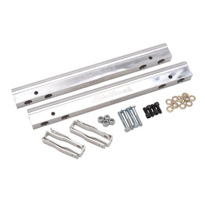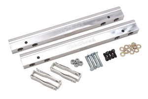 All Edelbrock fuel rails are machined from high quality extruded aluminum. Each kit includes fuel rails, stands and mounting hardware. Fuel fittings, crossover line and regulator not included. 3630 fuel rail kit Small-Block Chevy (For use with Victor E Manifold #29785 and standard injectors) with Clear Anodized Finish and -6 AN inlet/outlets.