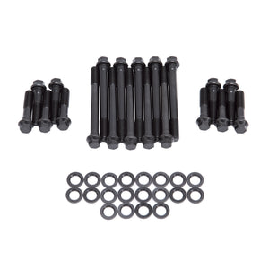 Edelbrock E-Series Cylinder Head Bolt Kit #85772 is a high-quality replacement bolt set for Chrysler 5.2L and 5.9L Magnum engines equipped with Performer RPM #61779 and #61775 aluminum heads. This kit contains all necessary parts to replace the factory head bolts. E-Series bolts have a yield tensile strength of 190,000 PSI for strong and reliable loading with generous filleting throughout to eliminate stress risers. Bolt threads are rolled after heat-treating for superior form and strength, while a small hex head provides extra space for socket clearance in tight situations. E-Series Cylinder Head Bolts have a durable black oxide finish with sealer and come with the distinctive Edelbrock E stamped into the head.