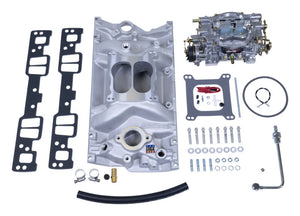 The Edelbrock #2007 Single-Quad Manifold and carb kit is designed for Small-Block Chevy with Vortec or Edelbrock E-Tec Cylinder head applications. With a Manifold and Carb Kit, it's easy to upgrade your induction system with the best combination of Edelbrock proven performance and looks in a single box. These kits include: an Edelbrock manifold, Performer or Thunder Series AVS carb, chrome fuel inlet, intake gasket set, intake bolt set and carb stud kit. The manifold and carbs are available with a standard satin finish or with our bright EnduraShine chrome-like finish for long lasting show quality looks.
