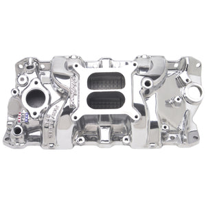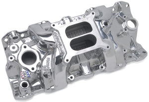 Edelbrock part #71011 Performer RPM intake manifold is designed for 1955-86 262-400 c.i.d. Chevy V8's, for maximum power and a broad torque curve for high- Performance'street/marine engines. Provides power like a single-plane and throttle response like a dual-plane. Has provisions to machine for an oil fill tube. No provisions for exhaust heated or stock-style choke. Accepts late-model water neck, air-conditioning, alternator and H.E.I. Will fit cast iron Chevrolet Bowtie heads, but will not fit 1987 and later cast iron heads. Intake manifolds will not fit under stock Corvette hood. This manifold offers a polished finish for a brilliant shine and classic look.