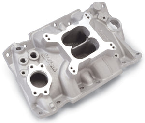 Edelbrock part #2111 Performer 90 degree V6 intake manifold is designed for street and marine 1985-95 200-229-262 c.i.d. (3.8 and 4.3L) Chevy V6s. Dual bolt pattern water neck fits both automotive and marine applications. Produced 18 more horsepower than an older manifold design on 4.3L marine engine. Will not accept stock automotive carbs or 262 T.B.I. unit.
