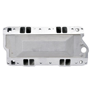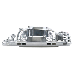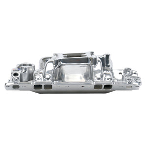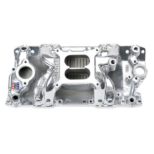 Edelbrock part #75011 RPM Air-Gap RPM intake manifold is designed for 1955-86 262-400 c.i.d. Chevrolet V8's. The award-winning RPM Air-Gap intake manifold incorporates the same race-winning technology that's used on our Victor Series competition intakes. The air-gap design features an open air space that separates the runners from the hot engine oil resulting in a cooler, denser charge for more power. Edelbrock's Performer RPM gives you the ultimate in street high-performance. Accepts all 1976 and later alternator and A/C brackets for the street. No provision for exhaust- heated chokes and no exhaust crossover. Not for 1987 and later cast iron heads and will not fit under stock Corvette hood. This manifold offers a polished finish for a brilliant shine and classic look.