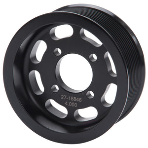 Edelbrock 4.000in. pulley part #15846 allows you to fine tune the airflow and performance of your Edelbrock C7 Corvette or Enforcer Supercharger system to your preference. The Edelbrock #15846 features a 10-rib design for use with our Edelbrock street rod and muscle car Supercharger systems. Edelbrock pulley part #15846 offers a Black Anodized finish. - 4in. 10-Rib Edelbrock's/C Pulley in Black Finish for Enforcer Systems