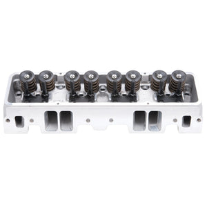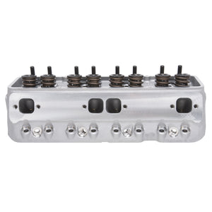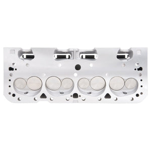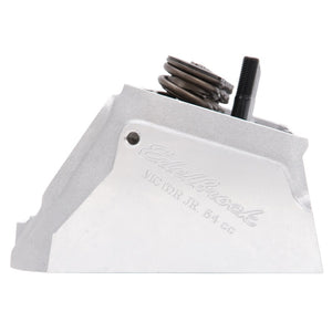 The Edelbrock part #77599 Small Block Chevy Victor Jr. 215cc cylinder head is an affordable version that will still allow for maximum power when used in competition and ultra high-performance's street applications. This cylinder head has the potential of 530-580 hp out-of-the-box, for a cost effective, race-winning set-up. These cylinder head features angled spark plug holes and accept standard 23deg valvetrain hardware. The 77599 cylinder head has a 64cc combustion chamber and come with springs for mechanical roller camshafts. The 64cc chambers yield about 12.5:1 compression with a 12cc domed piston in a 350 V8.