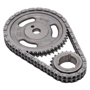 Edelbrock part #7813 Performer-Link timing chain is for use with Edelbrock or stock cams. They have a solid-bushing chain for a true bearing surface that rolls with the sprockets, eliminating chain stretch. Cam sprockets are made from 35,000 psi tensile strength cast iron. Crank sprockets are made from billet SAE-1144 steel and induction heat treated. Four Performer-Link sets are stock replacement parts and 50-state legal (see listings in bold type). All other sets have three keyway setting points to ensure accurate timing selection for early or late-model vehicles. Performer-Link timing sets are not for use above 6500 rpm- ? Performer roller chain sets are engineered to operate up to 6500 rpm.- ? Never hammer directly on chain or sprockets. You can crack the hardened links and pins and cause early failures. - ? Use a sleeve for installations that require hammering, a brass drift punch may be used if you carefully alternate blows on either side of the sprocket to avoid cocking. - ? Never stretch the chain with a screwdriver. - ? Check for clearance between the timing chain and block and between the chain and front cover before reassembly. - ? Be sure that both cam and crank sprockets are exactly in line with each other. Misalignment can cause chain to break