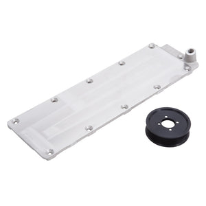 Edelbrock Part #15908 is a Valley Cover Plate and Larger Supercharger Drive Pulley needed to convert a #1598 Supercharger Kit intended for a Manual Transmission Camaro into a #1597 Supercharger Kit for an Automatic Camaro. Fits 2010-13. Note that this kit will void the optional warranty due to the necessity of removing the tamper-proof seal in order to install the drive pulley.