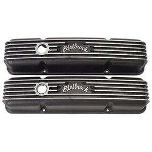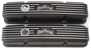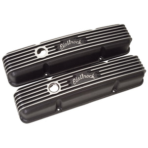 Edelbrock part #41443 Classic Series Valve Covers are designed for Chevy 262-400 V8 1959-86 (with oil fill hole) applications and have a Black powder coat finish. Edelbrock first made these aluminum valve covers in the late '50s and they're still a classic. Made of heavy-gauge sand-cast aluminum, Overall height is measured from base to top at the highest point. Edelbrock classic valve covers can be machined to accept breathers if desired.