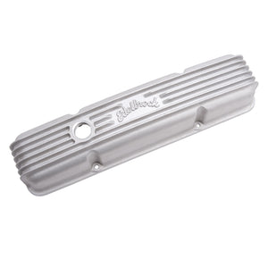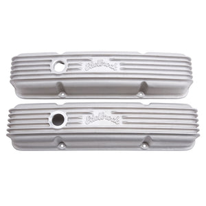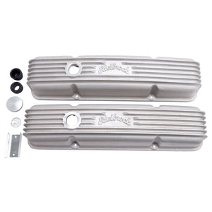 Edelbrock part #41449 Classic Series Valve Covers are designed for Chevy 262-400 V8 1959-86 (with oil fill hole) applications and have a Satin finish. Edelbrock first made these aluminum valve covers in the late '50s and they're still a classic. Made of heavy-gauge sand-cast aluminum, Overall height is measured from base to top at the highest point. Edelbrock classic valve covers can be machined to accept breathers if desired. Warranty