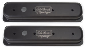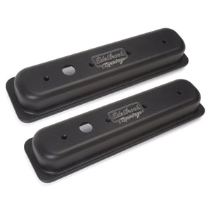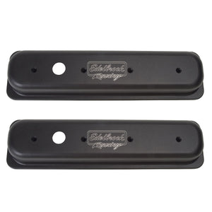Edelbrock part #41723 Victor Series Valve Covers are designed for Chevy 262-400 1986-95 with left breather hole (centerbolt) applications. Our Victor Series valve covers have a finely textured black powder coated finish for a pleasing and unique appearance. This is the same finish you'll find on our top-of-the-line Edelbrock/Musi 555 Crate Engine. These valve covers are manufactured from die-cast aluminum and machined with 1-1/4" breather hole. Overall height is measured from base to top at the highest point.