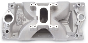 Edelbrock part #2901 Victor Jr. Sportsman 2V intake manifold is a dedicated design for the 2V racer and provides outstanding performance from 3500 to 7000 rpm. The runners are sized especially for 2V racing engines for the ultimate combination of torque and horsepower with better fuel distribution. An extra tall carburetor pad eliminates the need for spacers, and rear water outlets allow for a four corner coolant flow path if desired. It features dual distributor clamp locations, and port exits are sized to match cast iron Chevrolet Bowtie heads. Manifold accept standard restrictor plates and carb adapters. This manifold is a single-plane, high-rise intake designed for maximum race-winning power at higher engine speeds.