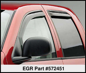 EGR Window Visors are made of a durable, scratch resistant, UV capped acrylic; which will keep your investment from fading, and keep it looking fresh for years to come. With most EGR Window Visors being available in Dark Smoke and Matte Black, customization will never be lacking for the upgrade enthusiast. EGR Window Visors feature an easy, no tools necessary, installation process; whether you choose the classic Tape-on style, or the more modern In-channel style, five minutes or less is all you need! Tape-on Visors utilize a dependable 3M adhesive tape, which will ensure that your EGR Window Visors aren’t going anywhere. All EGR Window Visors come standard with a Limited Lifetime Warranty; meaning that just like our Window Visors, EGR will always be by your side!