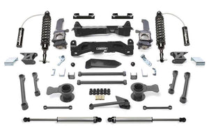 Fabtech's FJ system features extended length steering knuckles attaching to one piece lower control arm crossmembers for a full 6 inches of lift to clear 35'' tires. Front lower crossmembers feature adjustable alignment cams along with an integrated 1/4'' thick steel differential skid plate. The Basic system retains the front strut assembly for a smooth highway ride with ease of installation. The Performance system includes Fabtech's Dirt Logic 2.5 Coilover shocks, replacing the stock front strut assemblies. Both the Basic and Performance rear suspension systems include tubular upper and lower link arms, utilizing the stock rear coil springs for a supple highway ride with excellent offroad articulation. Installation does not require relocation of the Rack and Pinion or disassembly of the front strut assemblies. The stock front and rear driveshafts are retained due to Fabtech's precise suspension geometry.