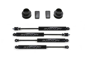 The 2.5in Lift system for 2014 3500 Rams, with factory Radius Arm front suspension, features more than just basic spacers. Dodge designed the front coil springs with a large bow to increase vehicle stability and handling. Unlike other flat spacers on the market, Fabtech's angled spacers retain this important feature preserving the factory ride characteristics. The front shocks are replaced with longer length Fabtech'stealth shocks to allow for full suspension travel while improving the damping of the front suspension. Extended length bump stops are included in this kit to prevent the coil springs from binding at full compression while also eliminating Trac Bar interference. Optional rear shocks are available separately. This kit can be removed to return the vehicle to stock. Estimated installation time - 1.5 hrs. No drilling or welding required.
