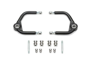 2017-19 Ford F150 Raptor 4WD - Fits 0-4in Lifts. Fabtech's Uniball Upper Control Arms provide increased strength to the front suspension by replacing the stock ball joint upper arms that can become worn and eventually fail under aggressive offroad use. These heavy duty upper arms are designed for longevity in rugged offroad conditions. They also feature additional caster compared to stock upper arms for superior on road use with oversized tires. The top quality construction of these arms include .120in wall 1.50in OD 4130 Chromoly tubing and American made 1in FK Stainless PTFE lined Uniballs. The 17-4 Stainless Steel heat treated Uniball pins fit into the factory ball joint tapers without modification to the spindle for easy return to stock feature. Fabtech uses 17-4 Stainless steel for the misalignments that provide proper clearance of the 1in Uniballs throughout the travel range. On the frame side of the upper arms, there are quality urethane bushings that help reduce road noise while providing longevity. Fabtech's Uniball Upper Control Arms are an excellent upgrade to stock or lifted suspension systems for drivers that demand the best for their vehicle. Features: Arms eliminate factory upper ball joint w/ super strong 1in ID Stainless Steel American Uniball for increased suspension strength. Additional caster is built into Arms for enhanced align ability with oversized tires. 1.50in OD .120in wall 4130 Chromoly tubing reduces flex found in stock arms for more positive road feel. 17-4 Heat treated Uniball pin fits into factory ball joint taper without modification to the spindle for easy return to stock feature. 17-4 Stainless steel misalignments for proper clearance of large Uniballs throughout the travel range. 250 wall DOM bushing barrels with welded gussets for strength. Uniball Upper Control Arms.