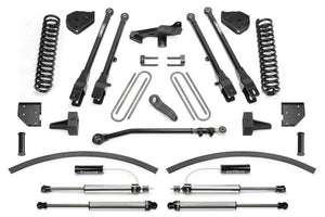 Fabtech?s 8" 4 Link Conversion System for the Ford Super Duty is designed to provide maximum suspension performance for both on and offroad use. The system replaces the factory Radius Arm suspension with heavy duty 4 Link components for increased strength and functionality. The system will provide less caster change throughout the travel range which benefits on road driving. When offroad the 4 Link system will provide more articulation than a Radius Arm for increased terrain traversing at all speeds. Unique to this 8" system is Fabtech?s extended length Track Bar to address the hyper sensitive steering box of the late model Super Duty. Fabtech is the only manufacturer with this exclusive system that offers proper steering performance. Fabtech?s extended length Track Bar is 4" longer than stock and is offset to the driver side with a stout 1/4" thick steel mounting bracket. This design helps keep the Track Bar and Draglink closer to parallel than the factory angles to reduce push in the steering. The Track Bar allows for full lock steering of 15.50 wide tires w/ 4 3/4" BS wheels. Fabtech?s 4 Link System has been proven in over 10 years of service in rugged commercial and military applications to ensure long life on your daily driven vehicle. High quality components with properly designed suspension geometry makes this Super Duty system the pinnacle of all suspensions. Comes with a free 5 year 60,000 mile powertrain warranty.