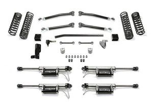 This Trail system provides enhanced suspension performance to address all variants of off highway travel use including rock crawling, aggressive trail use and overland expeditions. On road, the suspension has been tuned with proper dual rate coil springs and shock valving to provide a very compliant ride that you will appreciate. The system is a complete short arm suspension that utilizes the factory control arm mounts for an easy installation. The Fabtech heavy duty link arms are constructed of 1.75? OD. .250? thick wall steel tubing that are guaranteed never to bend. They come with large poly urethane bushings on one end with internal threads on the other to accept the ground breaking Fabtech 5 Ton Joint for longevity and a quiet ride. Fabtech?s long travel Dual Rate coil Springs are corner specific to the JL. This keeps the vehicle level side to side and allows for increased suspension travel. The first stage of the spring provides a soft ride with the ability to extend for additional travel. The second stage is designed to handle the payload of the vehicle and address large impact absorption at higher speeds. To address the steering geometry with the increased ride height, a Draglink Flip System along with a heavy duty Track Bar bracket is included. This relocates the steering geometry to the factory plane allowing for full articulation without binding the draglink ends in extreme conditions. The factory angle of the draglink to the pitman arm does not change and there is no increased side load on the steering box sector shaft as compared to using a dropped pitman arm. This helps extends the life of the steering box with the increased ride height. The heavy duty rear Track Bar bracket with side support maintains the factory roll center of the vehicle while centering the axle. Front and rear bumps stop extensions protect the suspension from over cycling. Each Fabtech component has been designed with specific features and benefits that create this quality su
